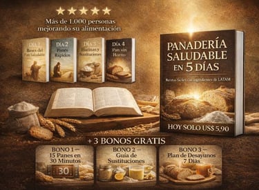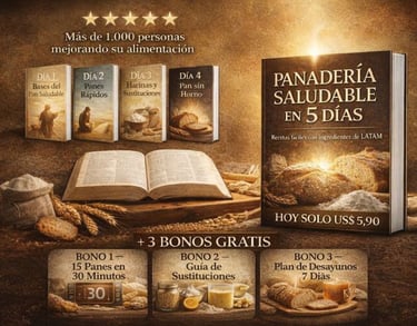 Panadería saludable en 5 días” es la guía práctica que te toma de la mano y te acompaña en cada paso, para que hornees panes caseros saludables y deliciosos, incluso si nunca has hecho pan antes.